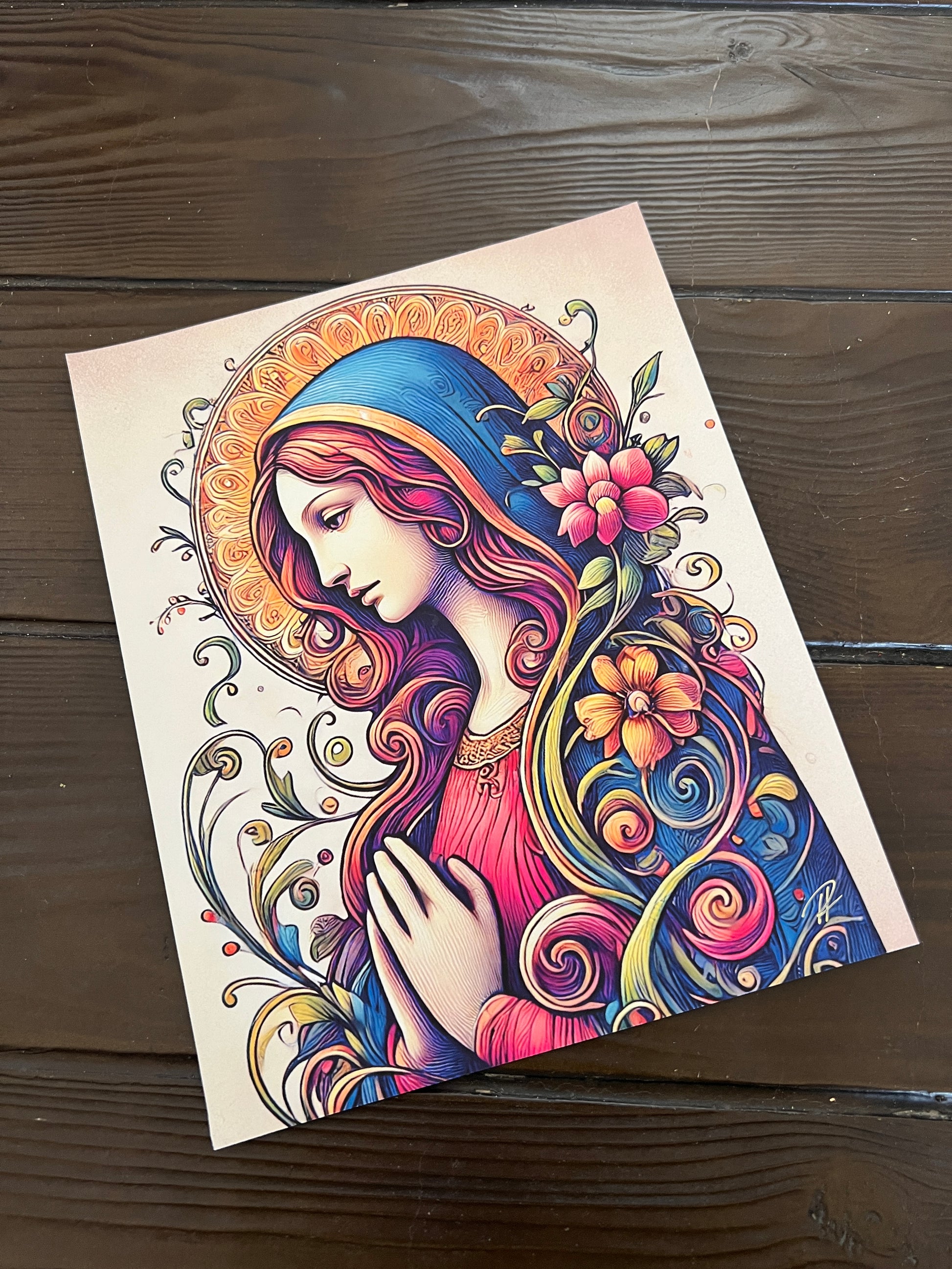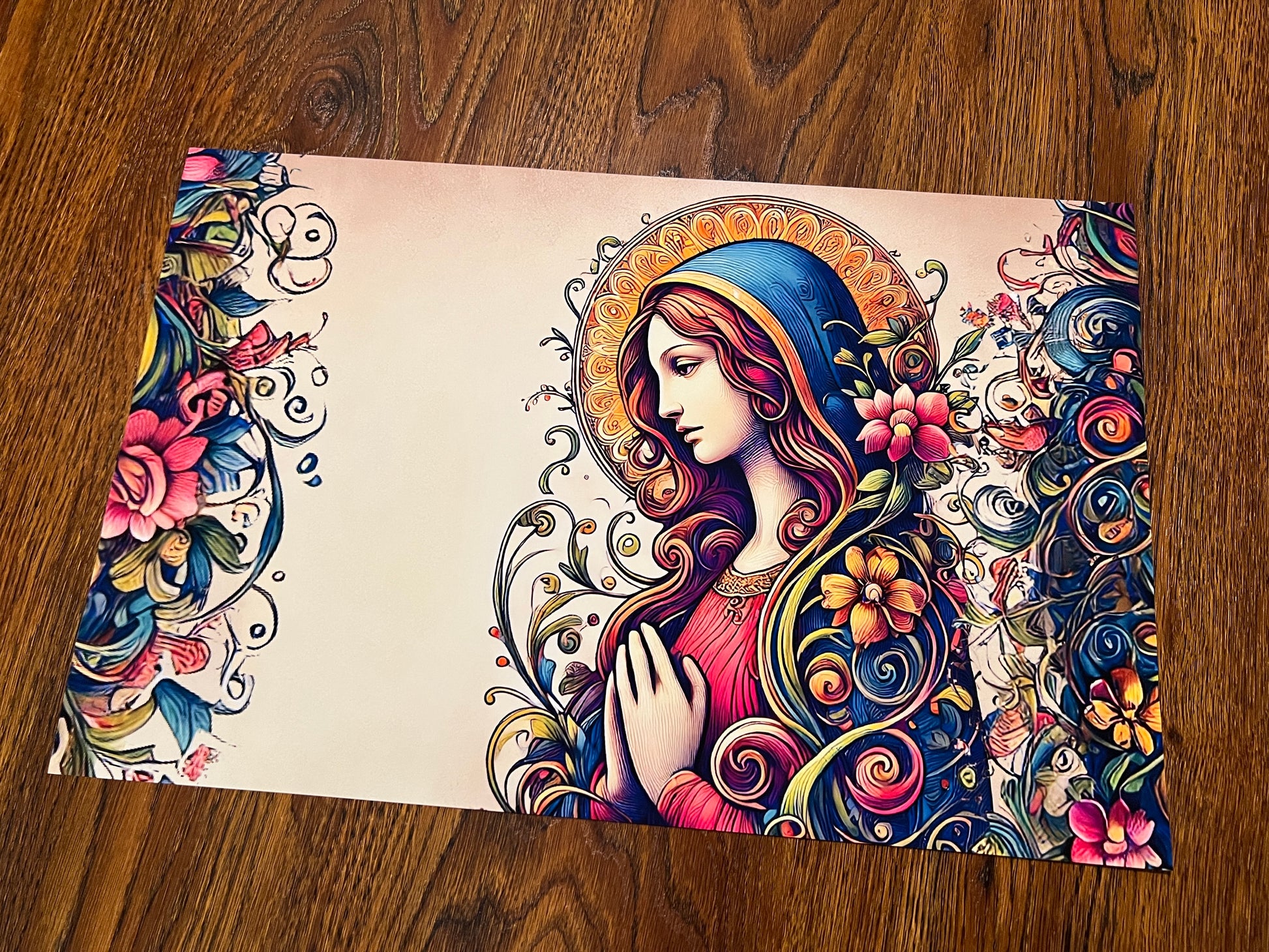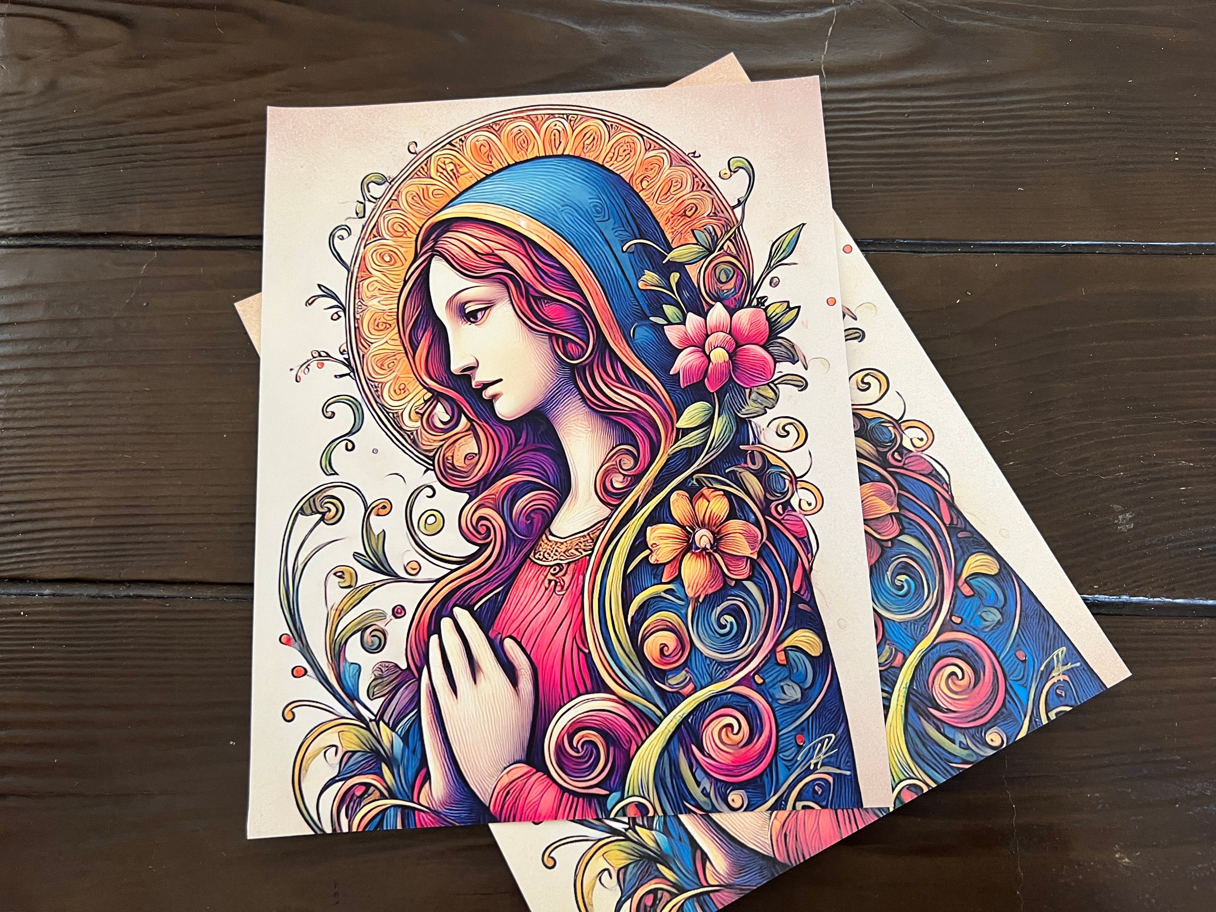 This radiant portrayal of the Virgin Mary blends floral elegance with divine serenity. With hands clasped in prayer and a golden halo behind her, she is wrapped in vines and petals, her robes blooming with gentle life. The colors are soft yet vibrant, evoking compassion, fertility, and devotion. A timeless symbol of grace and feminine divinity.