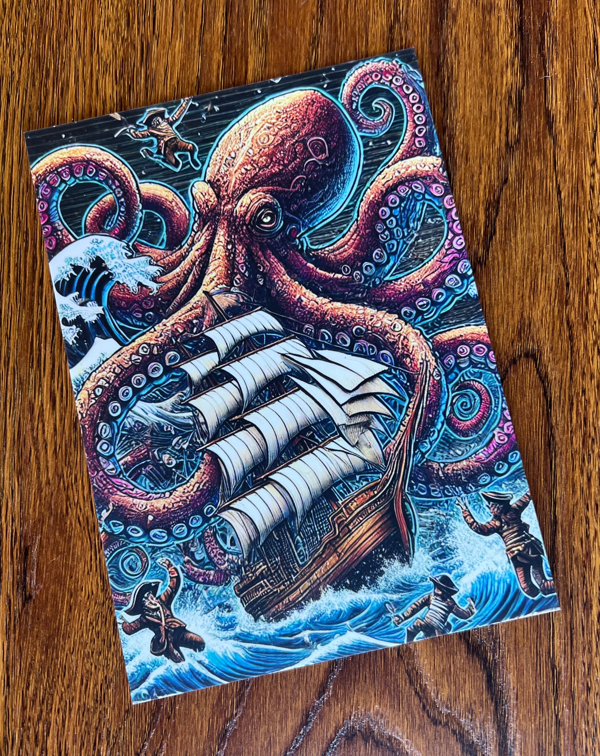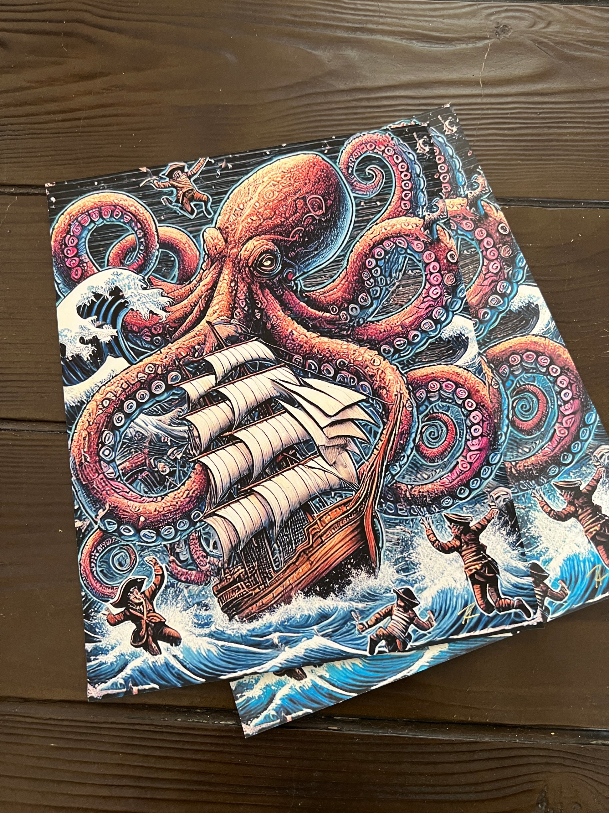 A monstrous kraken bursts from the watery deep, its curling limbs shattering sails and tossing pirates to the mercy of Poseidon. “The Kraken Awakens” is a high-drama tribute to nautical nightmares and mythic sea lore, rendered in vivid detail. Perfect for lovers of adventure, cryptids, maritime legends, and chaos summoned by salt and storm. No one sails away untouched.