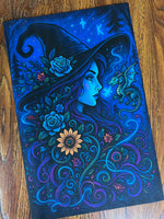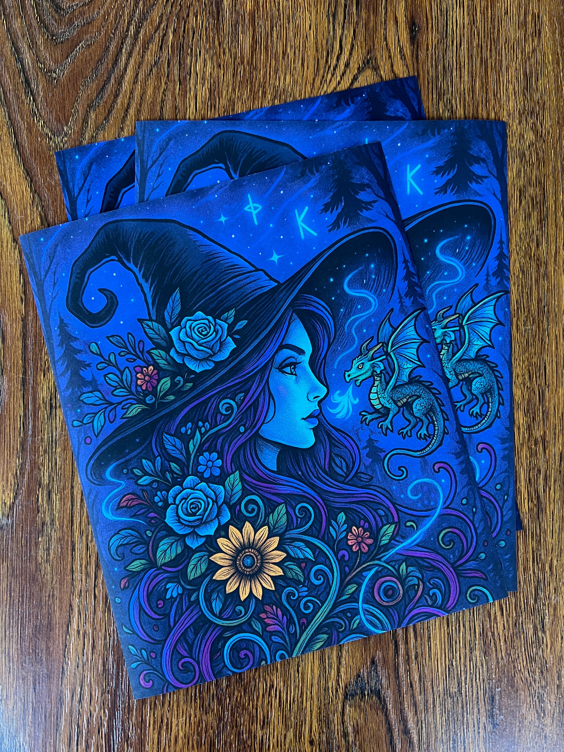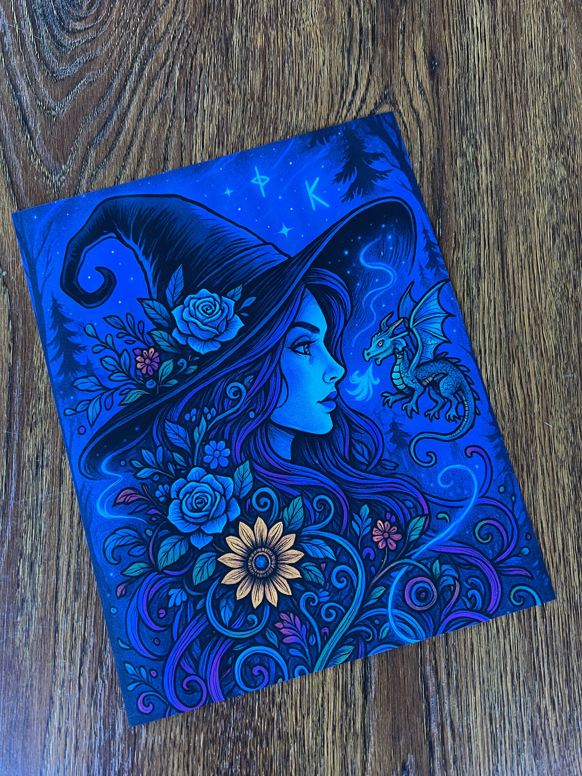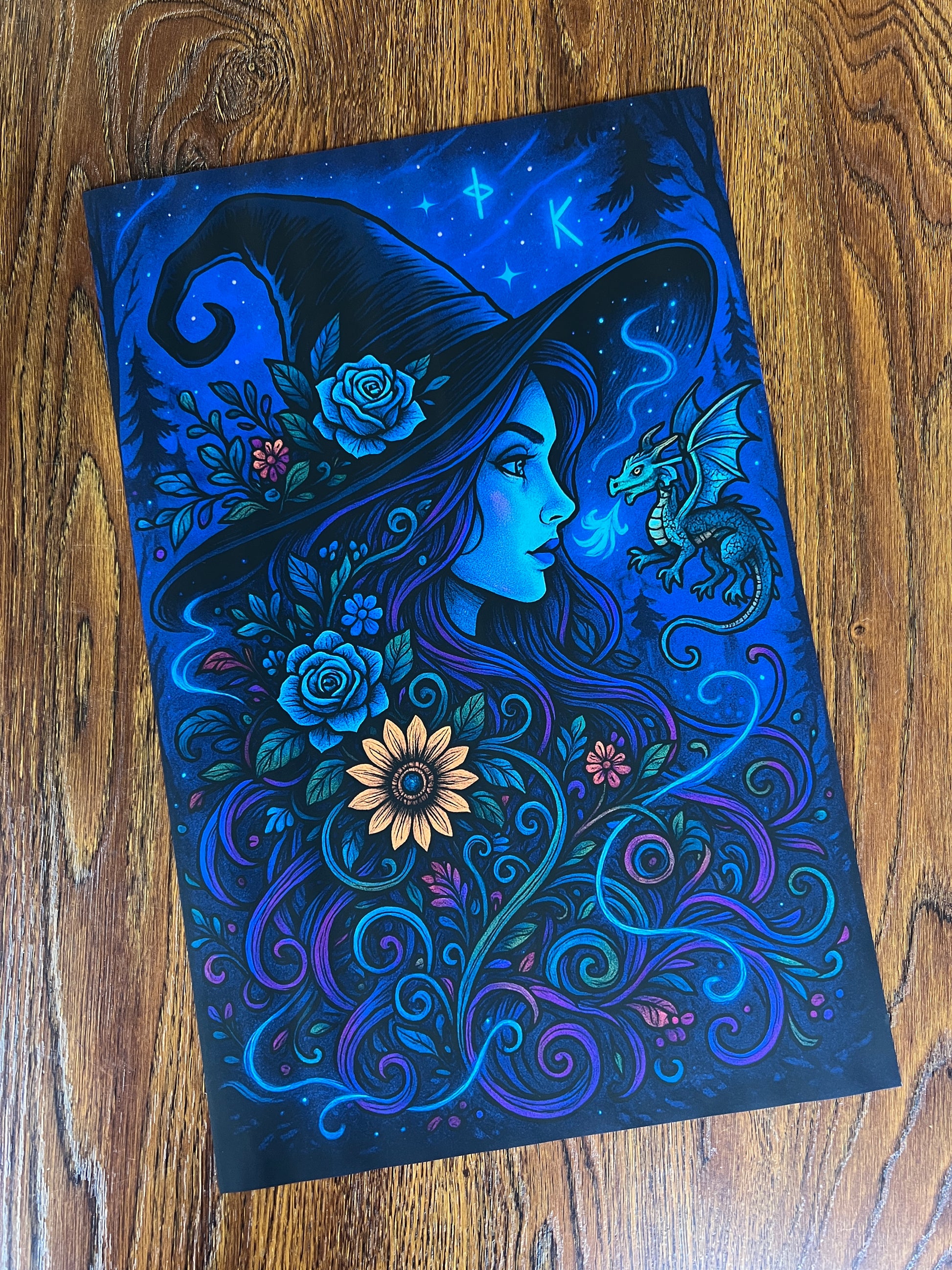 Set against a twilight forest aglow with runes and stars, this ethereal witch forms a sacred bond with a baby dragon—a spark of magick made manifest. Her gaze is calm, her power quiet but immense. Enchanted curls spiral into floral galaxies, while her wide-brimmed hat shields secrets not yet spoken. A vibrant celebration of inner strength, otherworldly connection, and ancient enchantments.