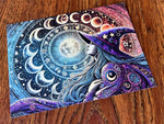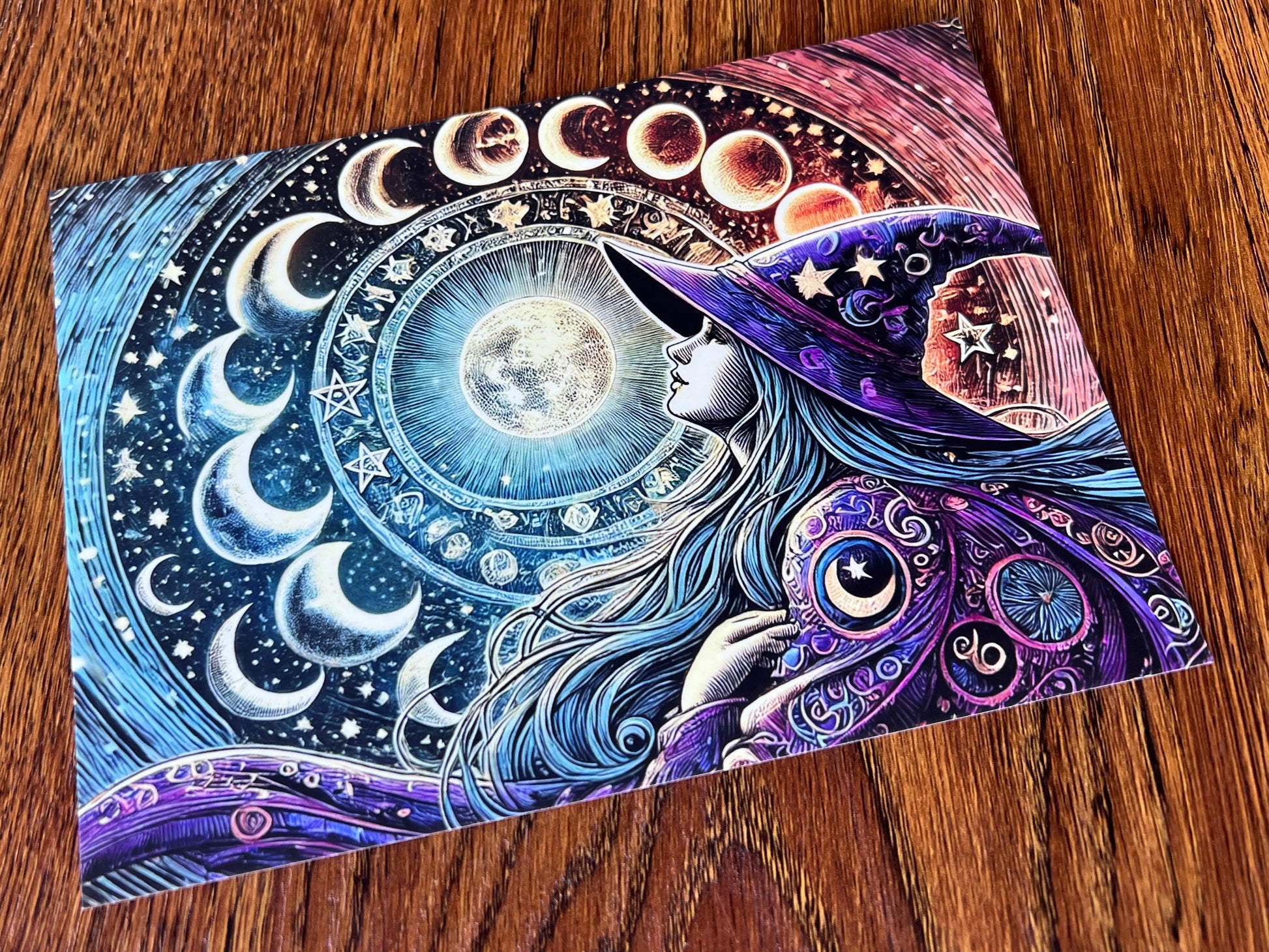 With a knowing gaze turned toward the heavens, this cosmic witch stands between sun and shadow. Cloaked in lunar robes, she aligns herself with the wheel of phases — waxing, waning, and full. A deeply mystical portrait of moon worship and celestial timing.