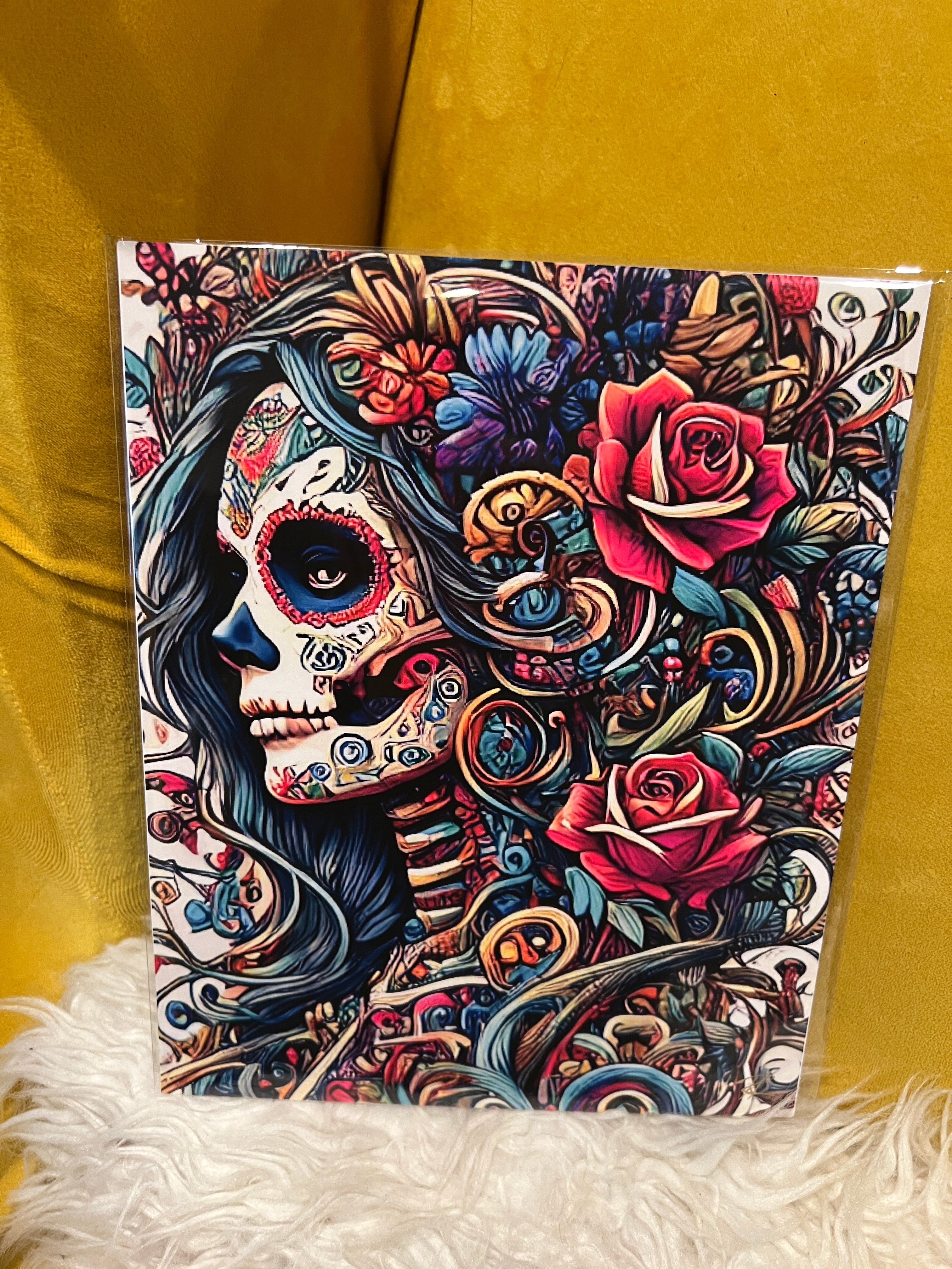A lush explosion of color and sacred symbolism, this vibrant art print honors the beautiful paradox of life and death. Santa Muerte’s or La Catrina's face, painted in the iconic sugar skull style, emerges gracefully from a wild bloom of roses, vines, and spiraling florals. Each petal and curl seems to whisper stories of transformation, memory, and mystic reverence. This piece celebrates the spirit that walks between worlds—a goddess of endings wrapped in a tapestry of eternal bloom. Perfect for altars, Dia de los Muertos celebrations, or simply inviting bold magic into your space.