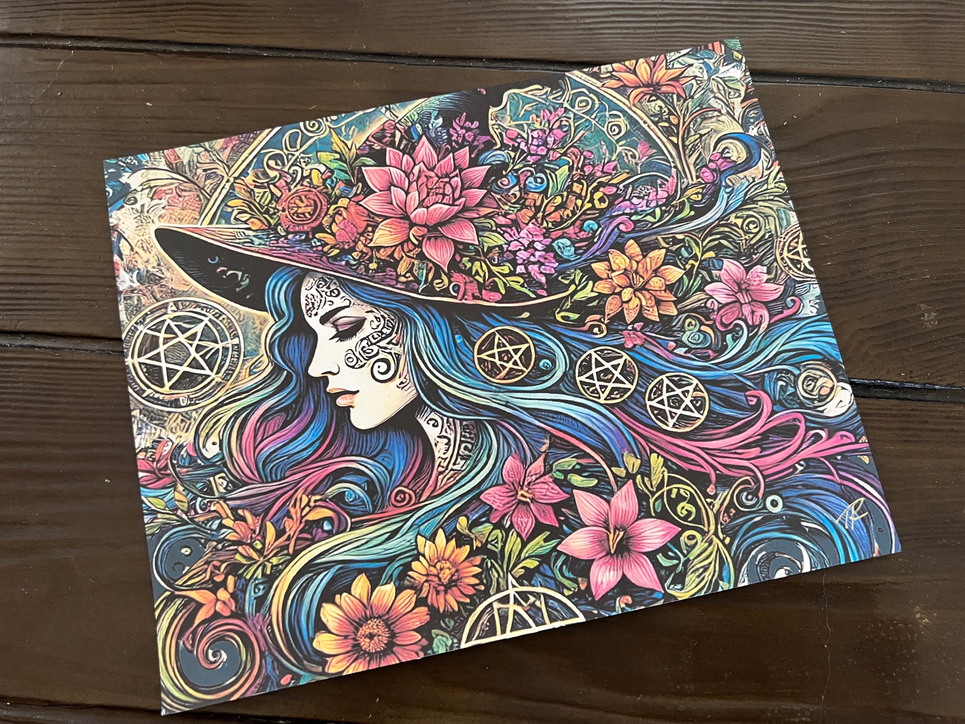 Bold, radiant, and utterly spellbound, this floral witch blooms with magic. Her hat is crowned with lilies, violets, and stars; her swirling hair dances with pentacles, leaves, and celestial glyphs. Saturated in vivid jewel tones and bursting with detail, this print is a celebration of living magic—beauty, wildness, and power braided into every lock and leaf.