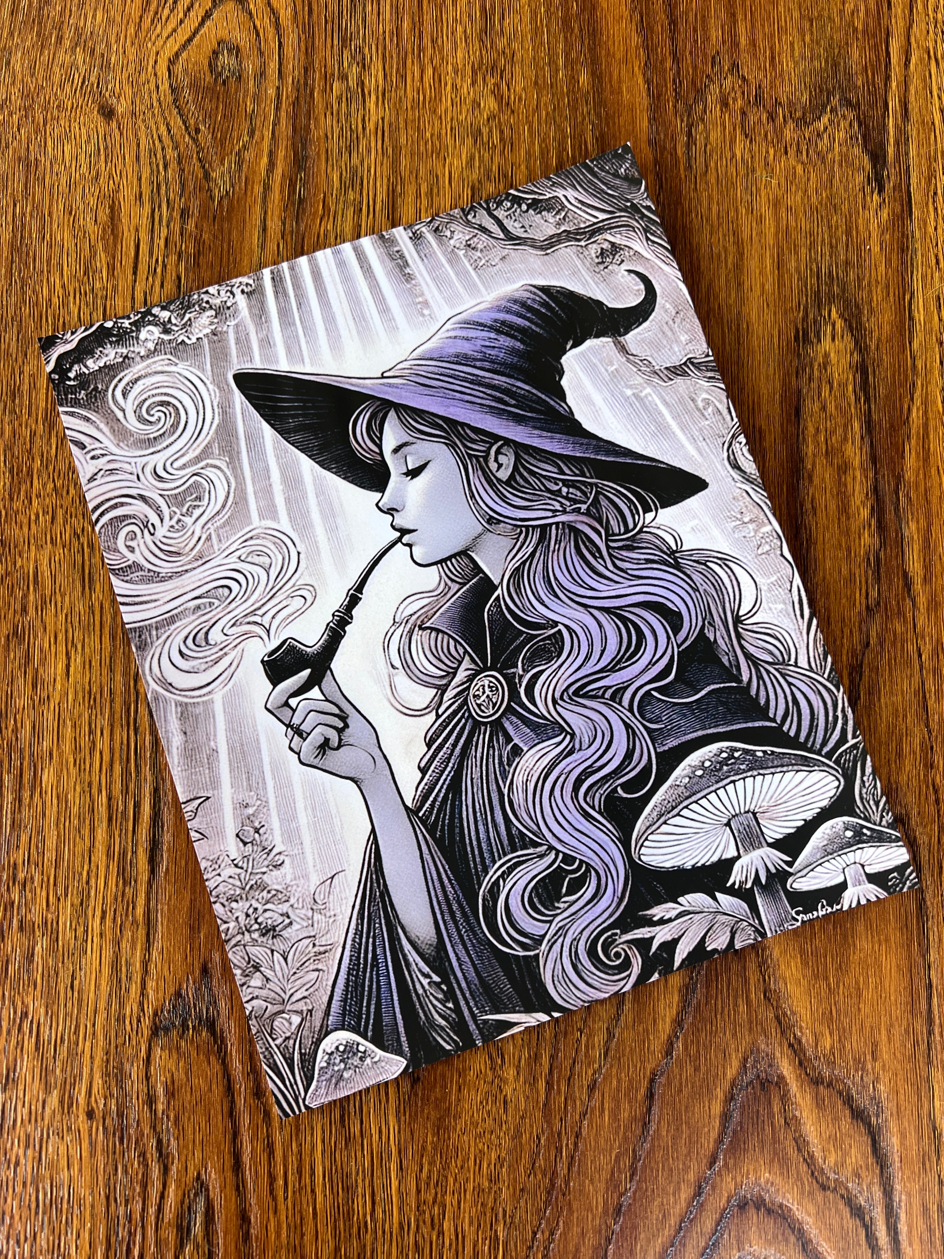 Deep within a twilight grove, a serene witch draws sacred smoke from her pipe. With closed eyes and an air of calm knowing, she communes with the forest spirits as mushrooms bloom at her feet. This piece invites introspection, stillness, and spellwork in silence.