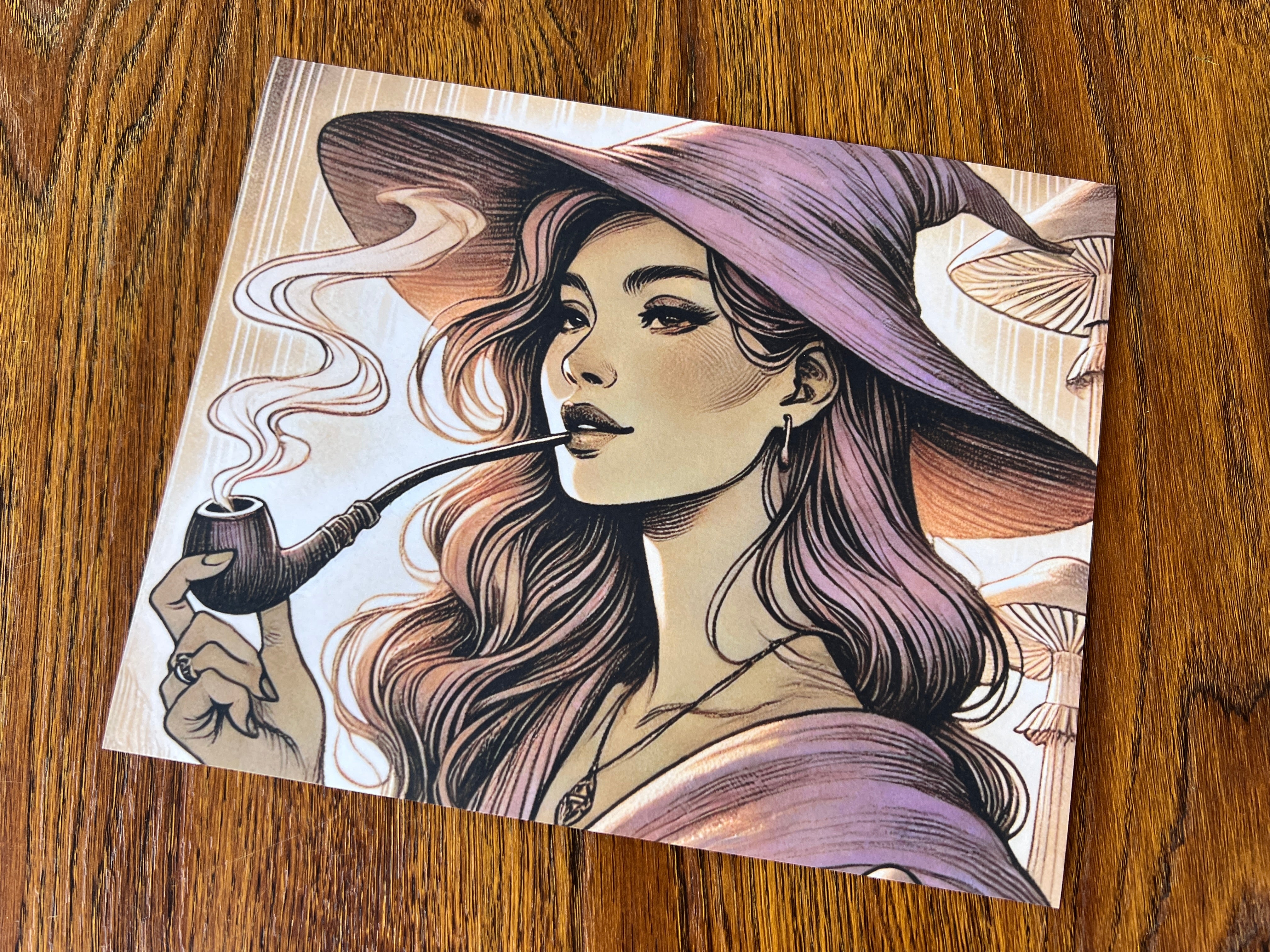 Bathed in warm amber glow and draped in soft lavender shadows, this witch smokes in elegant repose. Her rose-colored hat and soft features contrast with the power behind her calm demeanor. A portrait of modern mysticism, with old soul energy.