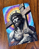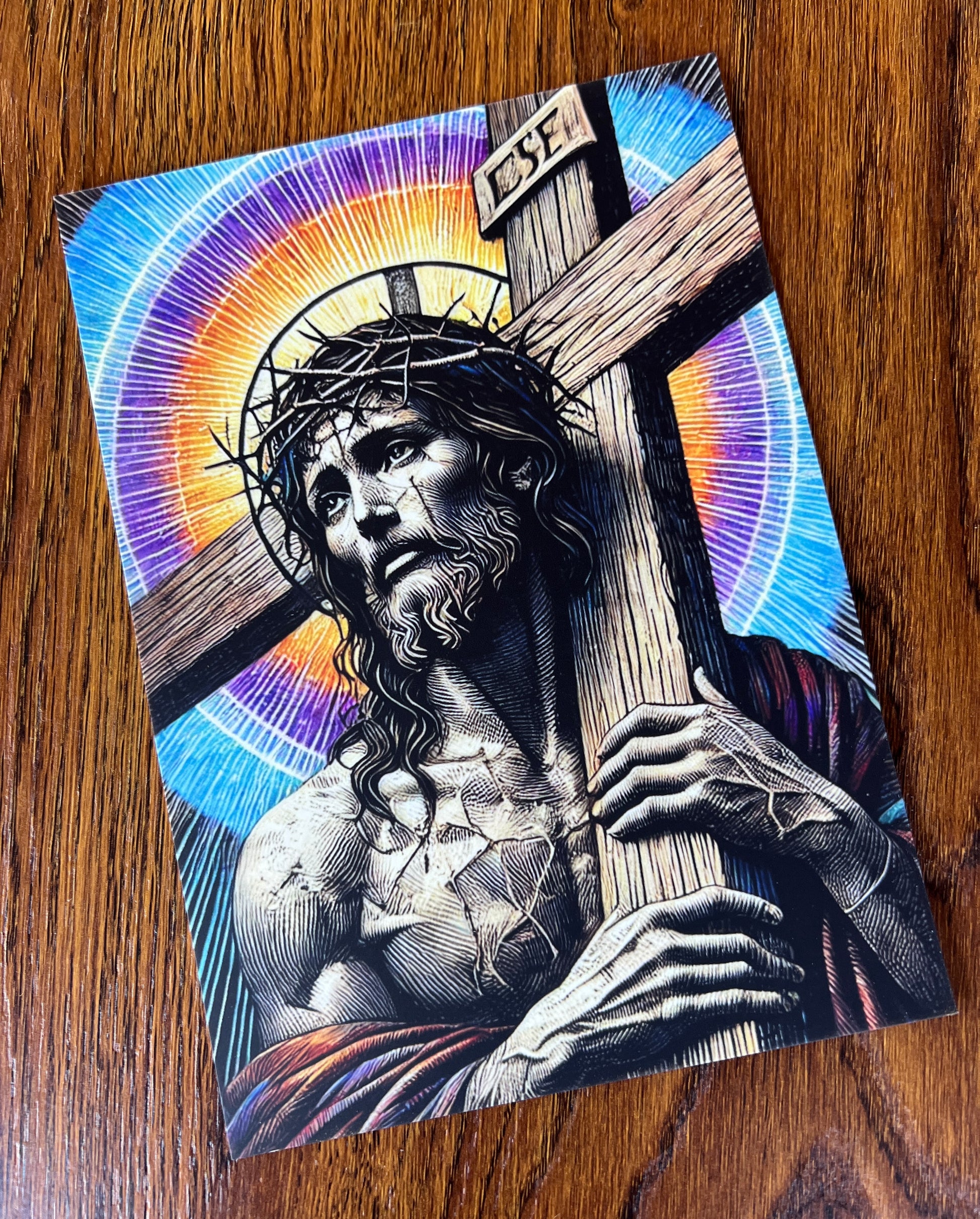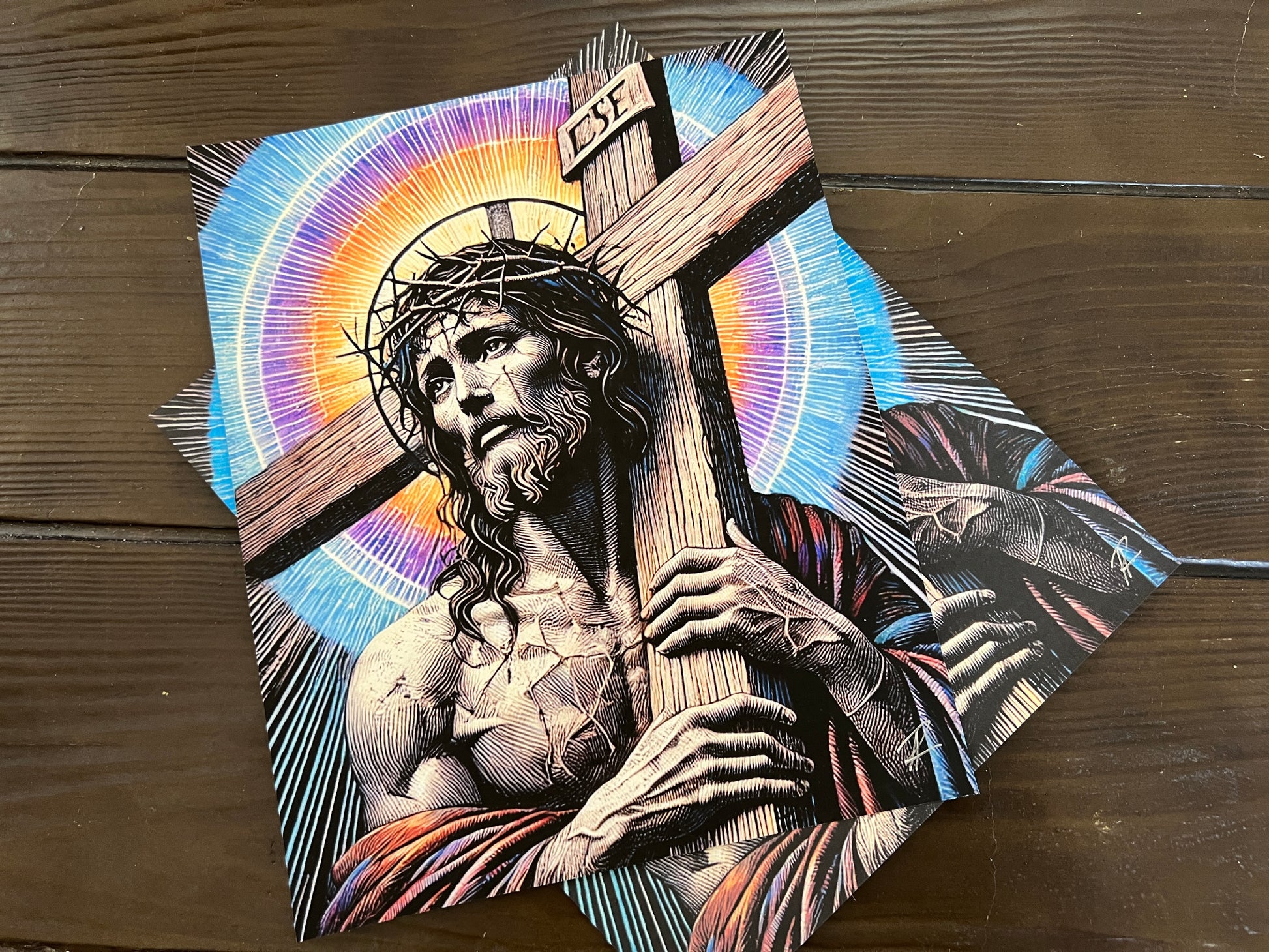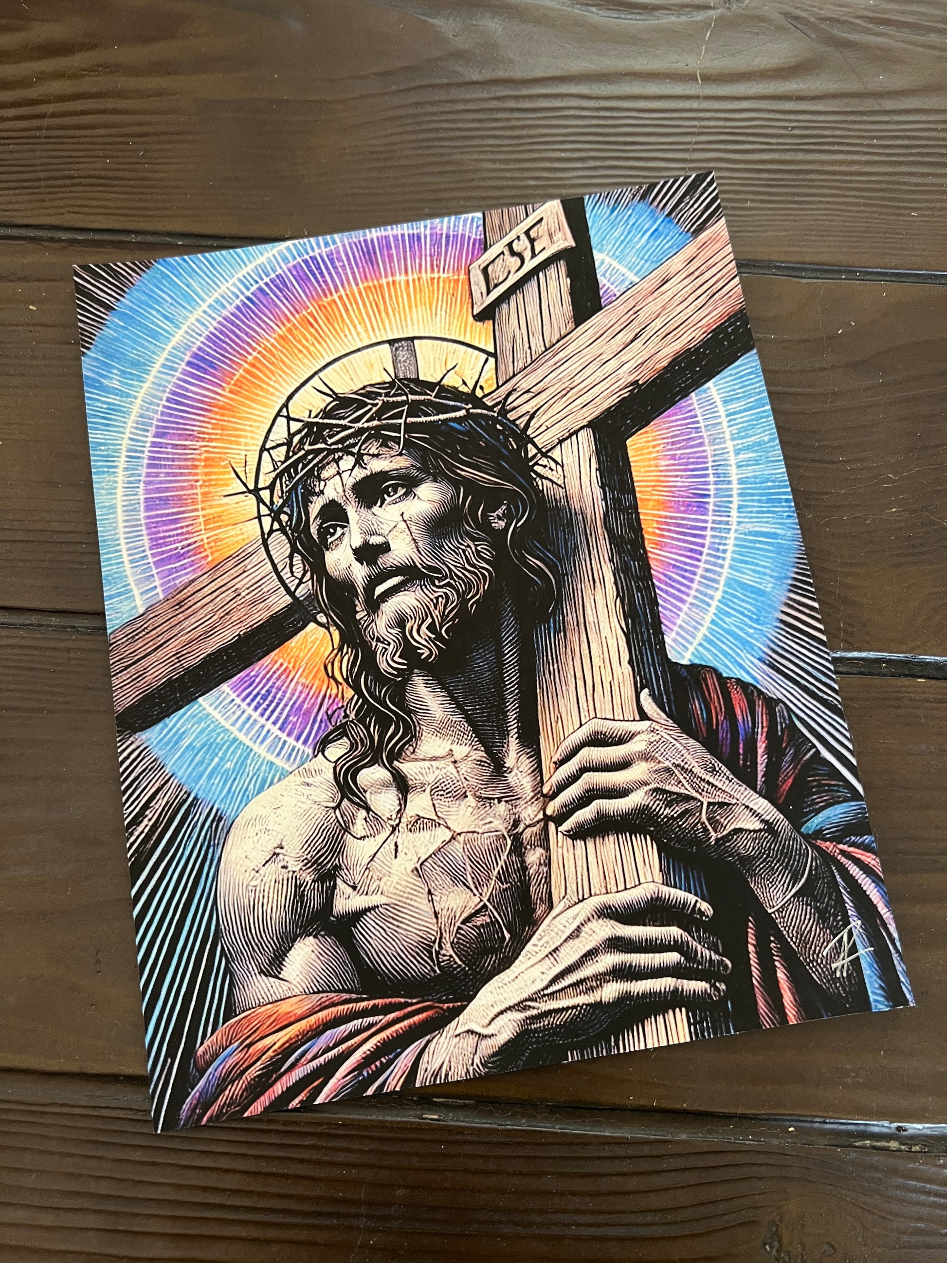 In this dramatic woodcut-style piece, Christ is captured at the moment of his burden-bearing walk, the cross resting heavy upon his shoulder. A radiant halo of rainbowed light breaks through the dark composition, suggesting transcendence through suffering. His expression is solemn yet resolved—a portrait of profound strength and divine sacrifice, rendered in meticulous lines and sacred contrasts.
