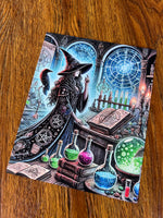 Standing in the sacred heart of her celestial laboratory, a witch commands the skies with a gesture. Potions simmer, scrolls spill secrets, and constellations echo on glowing astrolabes. Her robe glistens with planetary sigils, while a raven perches nearby, whispering omens from beyond the veil. A masterwork of starry craft and intuitive power.