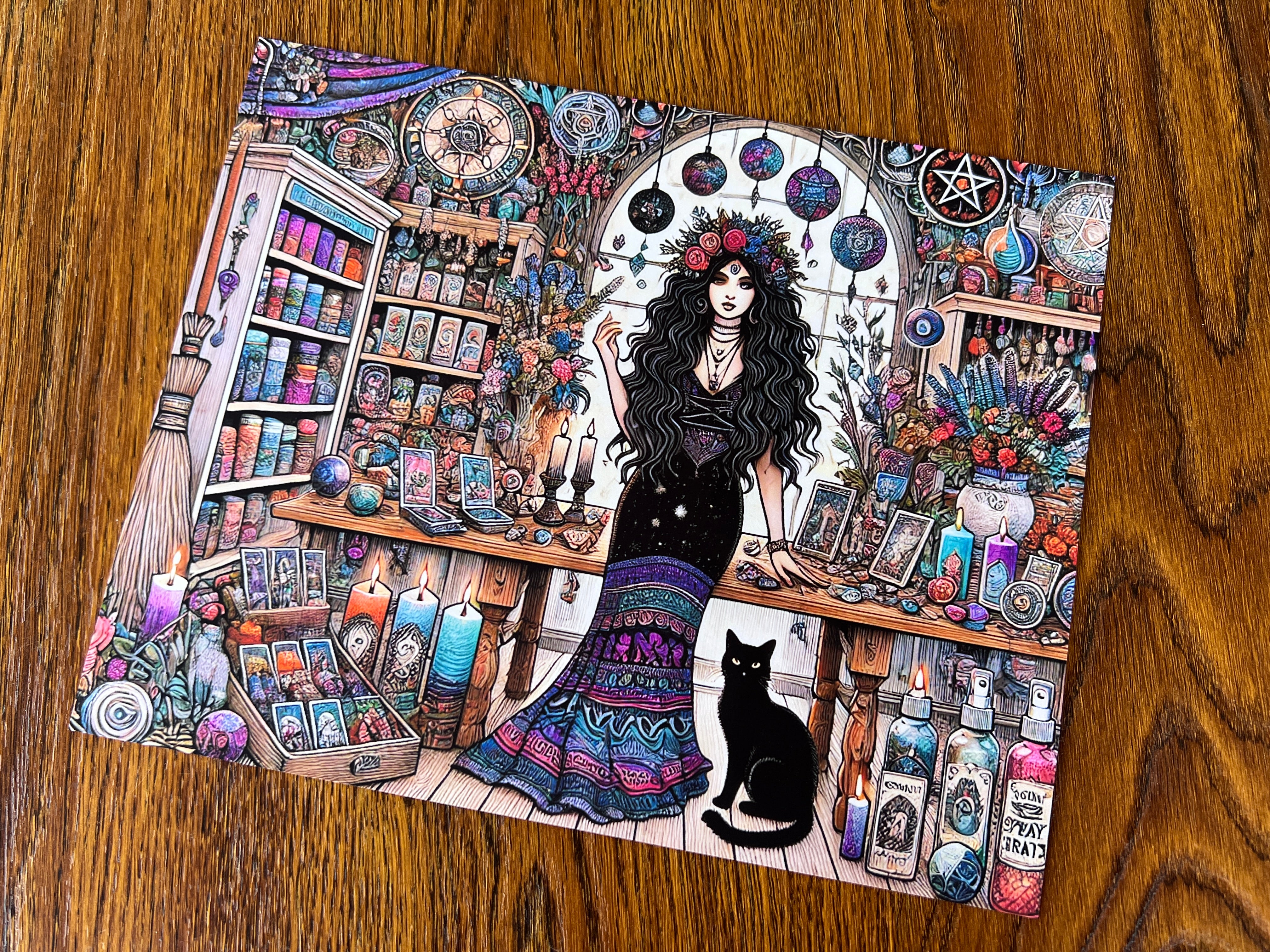 Draped in starlit textiles and crowned with roses, this witchly figure presides over a vibrant counter of candles, potions, and spell kits, all aglow in a mystical shop filled with herbs, sigils, and secrets. A black cat familiar sits watchfully by her side as pendulums and potion bottles whisper tales of divination and protection. This print captures the heart of the modern spellcrafter’s sacred space—alive with charm, color, and enchantment.