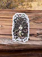 An elegant and eerie Medusa adorned in a regal crown of serpents and foliage. Her gaze is both deadly and divine, framed by coiled power and botanical beauty. Ideal for gothic goddesses, divine feminists, and fans of myth with bite.