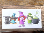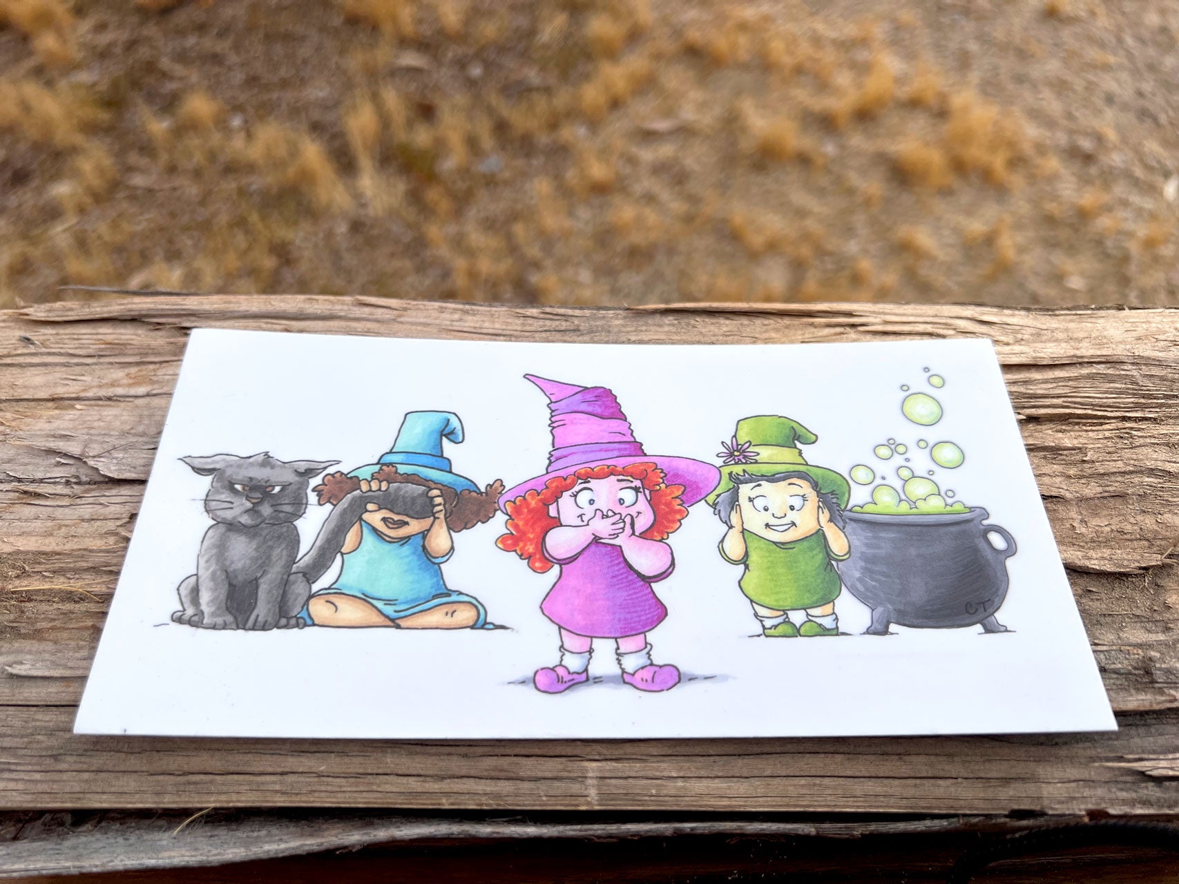 Three pint-sized witches stir up trouble, charm, and a whole cauldron of giggles. One peeks beneath her hat, another can’t hold back her gasp, and the third bubbles with green glee. Add the sassy black cat sidekick, and you’ve got a spellbinding coven of chaos. A parody twist on “see no evil, speak no evil, hear no evil” with a broomstick-wielding, bubbling cauldron trio of magical mayhem. These mini witches are wise...ish. Perfect for cards, packaging, or any place that needs a little enchantment with a wink.