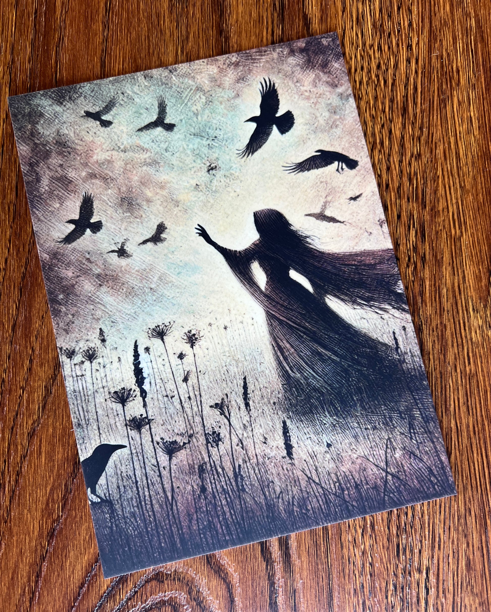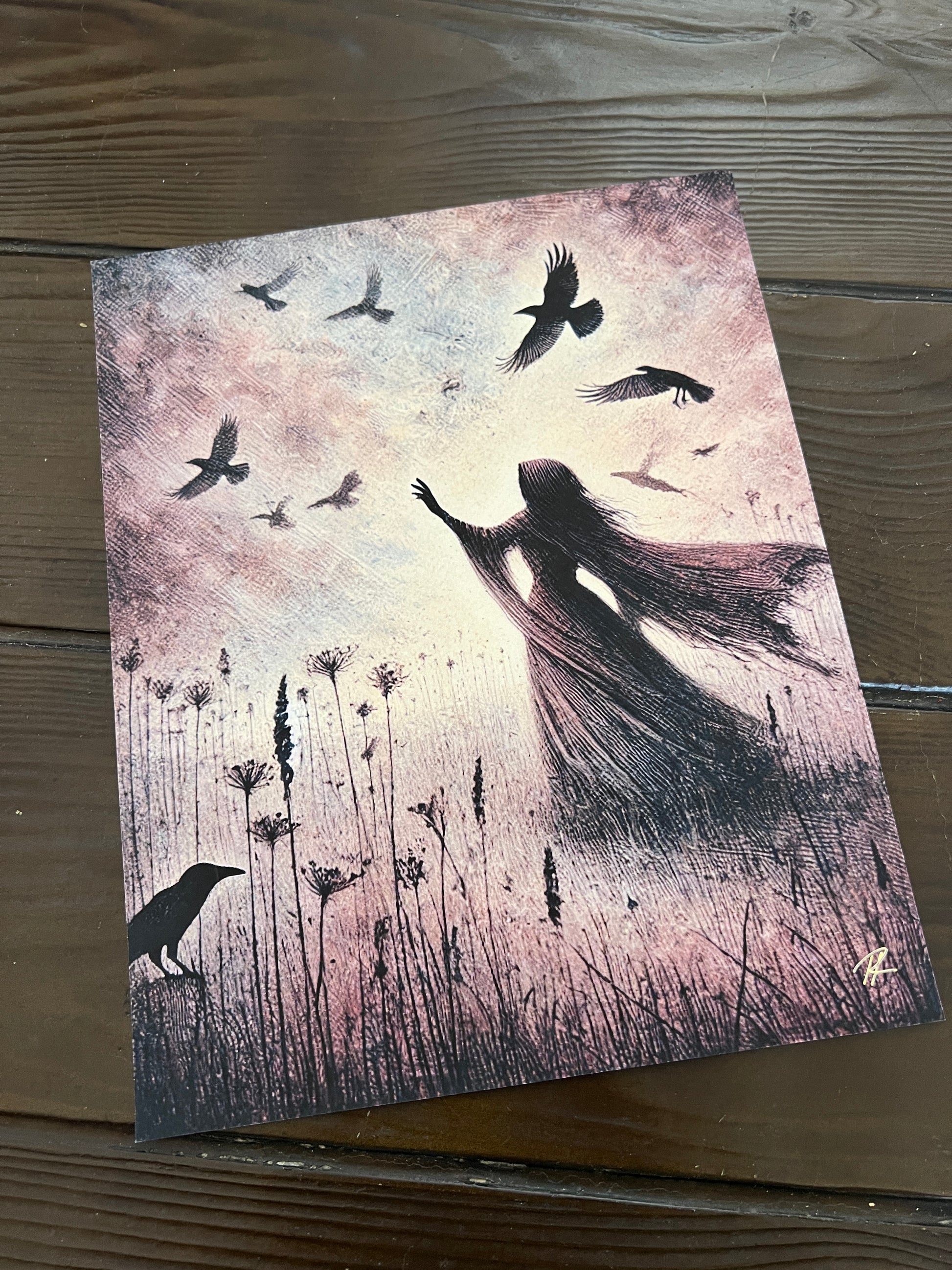 A lone silhouette reaches toward the sky as a murmuration of crows circles overhead, their wings carving the twilight like living sigils. Bathed in the soft blush of dusk, the figure stands amidst wild grasses and seed-laced shadows, a ghost of grace woven into the wild. The scene pulses with quiet power—mystery in motion, memory in flight. With warm tones of mauve, ash, and rose-gold, this evocative print speaks to the wild witch, the dreamwalker, the soul who communes with the sky. A tribute to release, intuition, and the sacred language of flight.