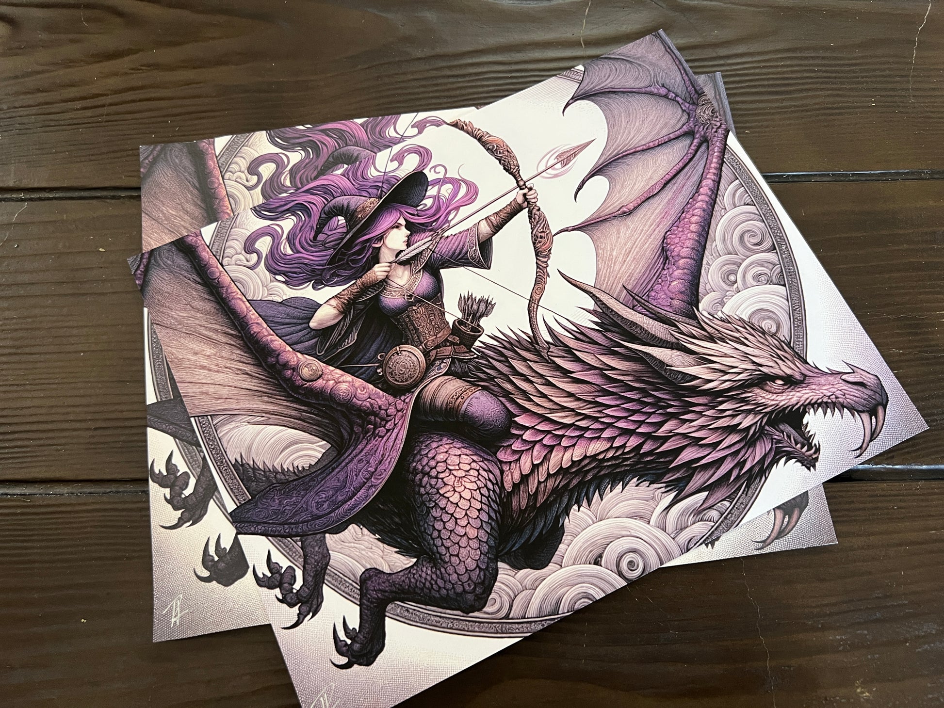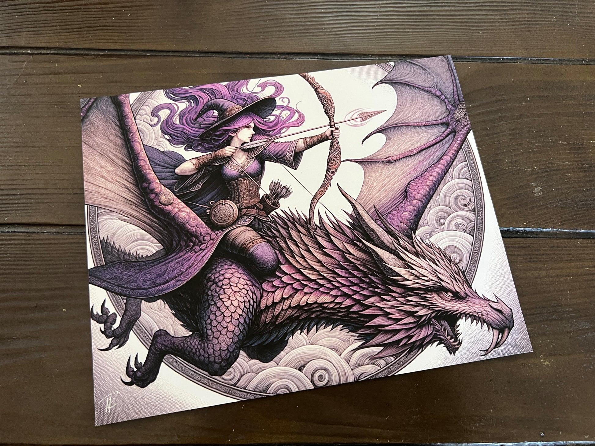 A witch mid-flight rides her mighty dragon through whorls of wind and cloud, bow drawn and arrow gleaming with intention. Her long, violet hair flows like wildfire in the sky, a mirror of the dragon’s shimmering plum scales and powerful wings. Spirals of spirit energy encircle them, echoing the magic woven into her belt, her bow, and the very fabric of the storm they command. This moment captures the breath before release—the pure alignment of purpose, instinct, and spellwork. A celebration of fierce focus, magical mastery, and the bond between witch and beast, this art print empowers all who move through life with aim and fire.