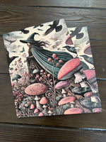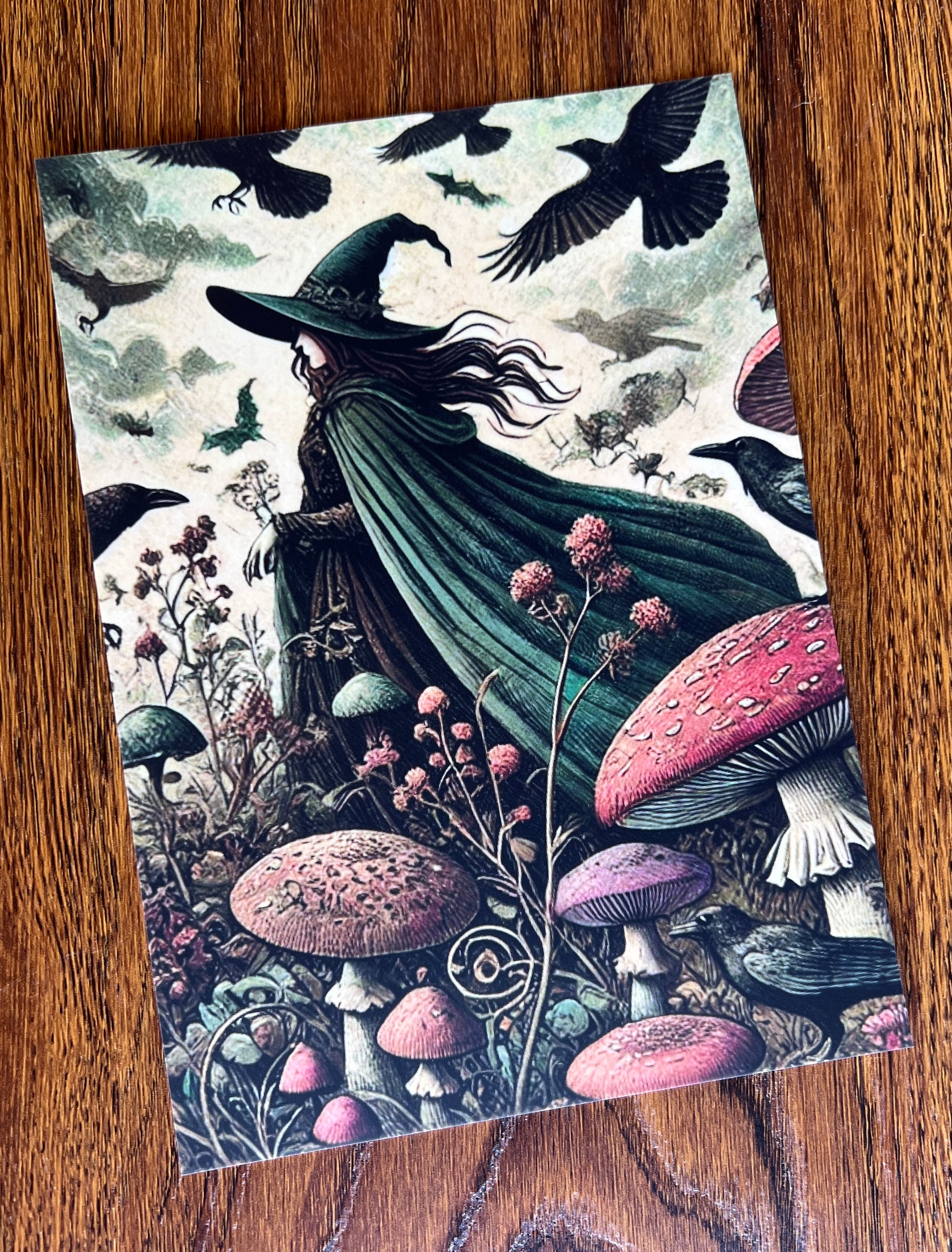 A solitary witch wanders through a wild forest where toadstools tower like ancient sentinels and ravens spiral above her like living omens. Cloaked in emerald shadows, she moves with purpose—part spell, part storm—her windblown hair and flowing cape alive with the breath of the woods. Mushrooms in shades of crimson, coral, and ash bloom beneath her feet, a mycelial kingdom steeped in mystery and magic. This richly textured artwork pulses with enchanted forest energy, perfect for lovers of fungi, familiars, and the spellbound strangeness of nature’s underworld.