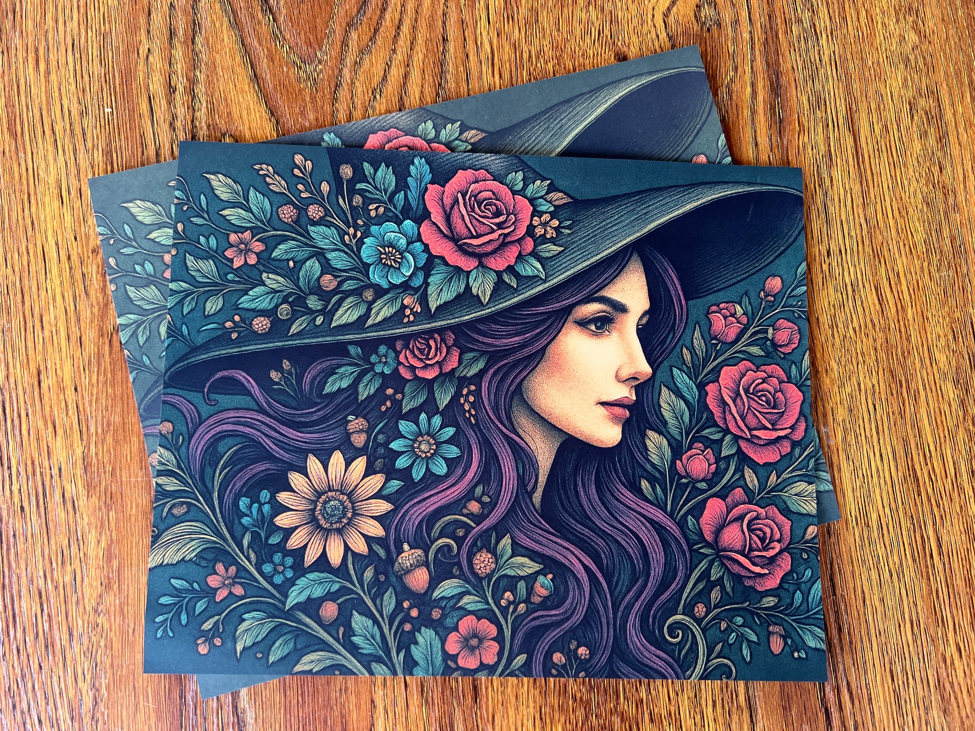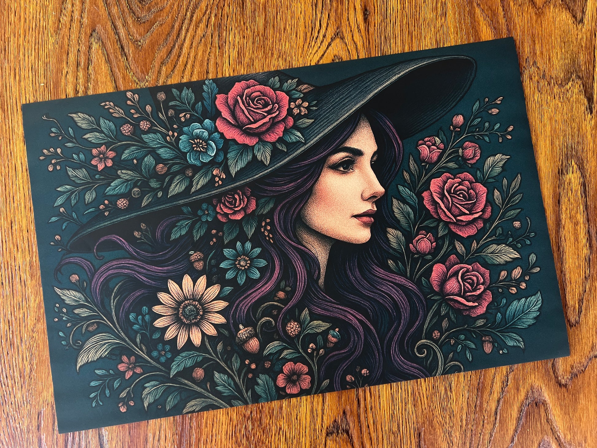 This portrait of a witch in profile is a moody, romantic whisper of twilight. Roses, sunflowers, and trailing vines frame her beneath the wide brim of a shadowed hat. With earthy reds, emeralds, and golds, this piece is a botanical reverie—deep, dreamy, and brimming with grounded enchantment.