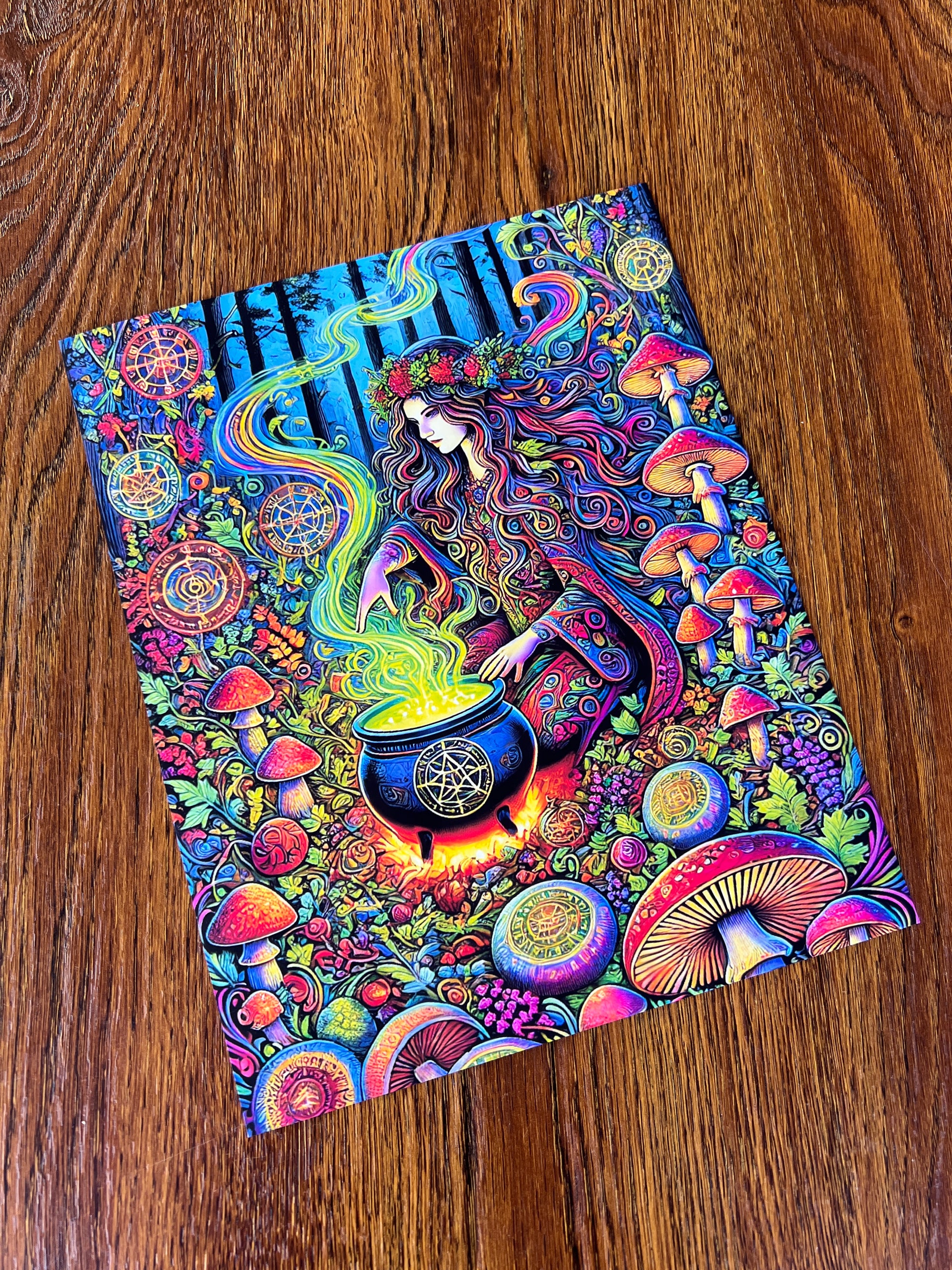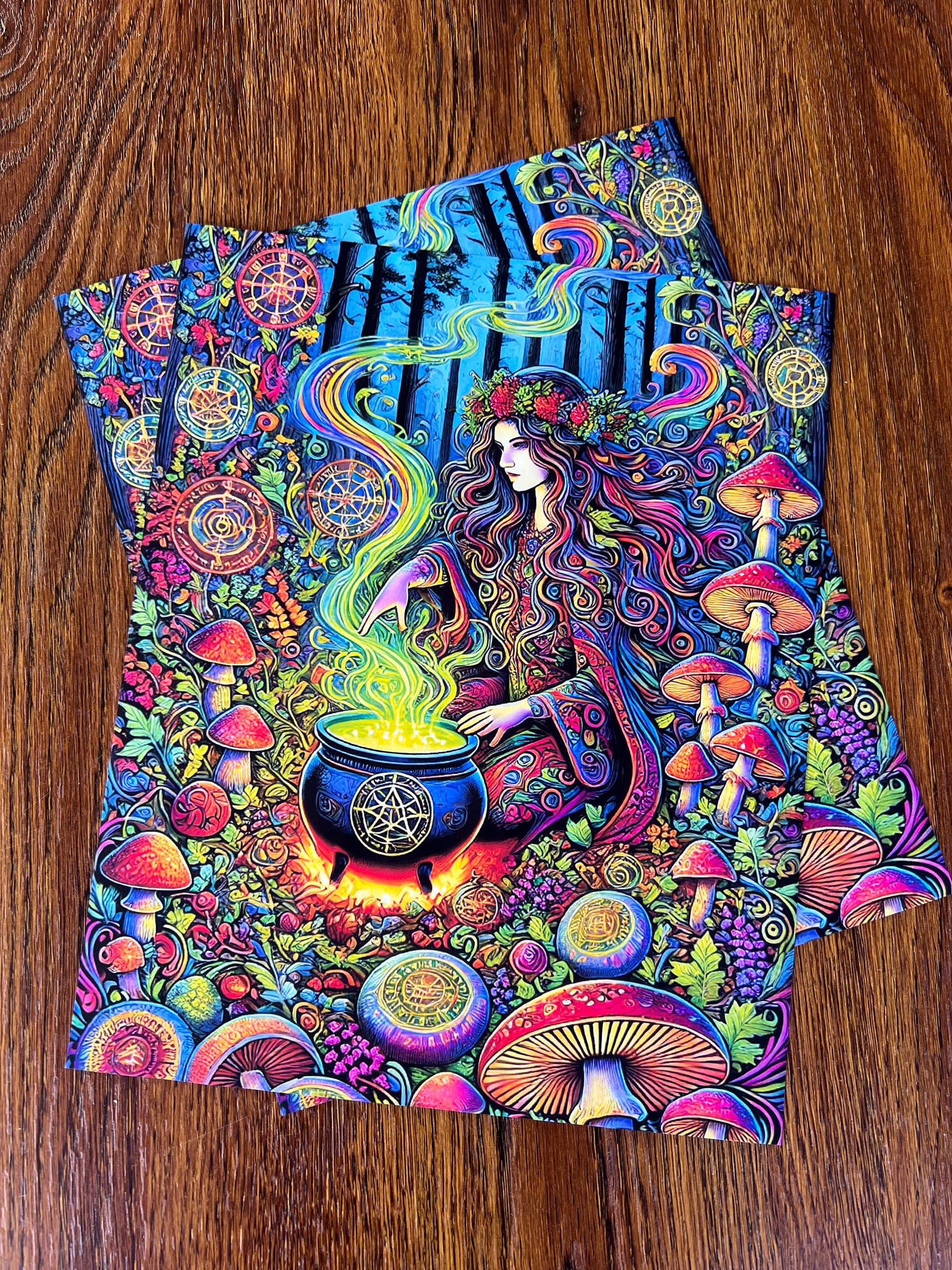 Drenched in neon spells and surrounded by rainbow mushrooms, this forest witch stirs her cauldron beneath towering trees and watchful eyes. Magic rises like smoke in technicolor waves, as mandalas and mushrooms bloom in every inch of this vibrant spellscape. It's pure visual enchantment — loud, lively, and utterly spellbound.
