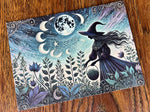 Beneath a swirling lunar sky, a witch tends a night garden blooming under the phases of the moon. With moonlight as her lantern and stars as her guide, she gathers herbs in harmony with celestial rhythms. A dreamy tribute to lunar cycles, green witchery, and moonlit harvests.