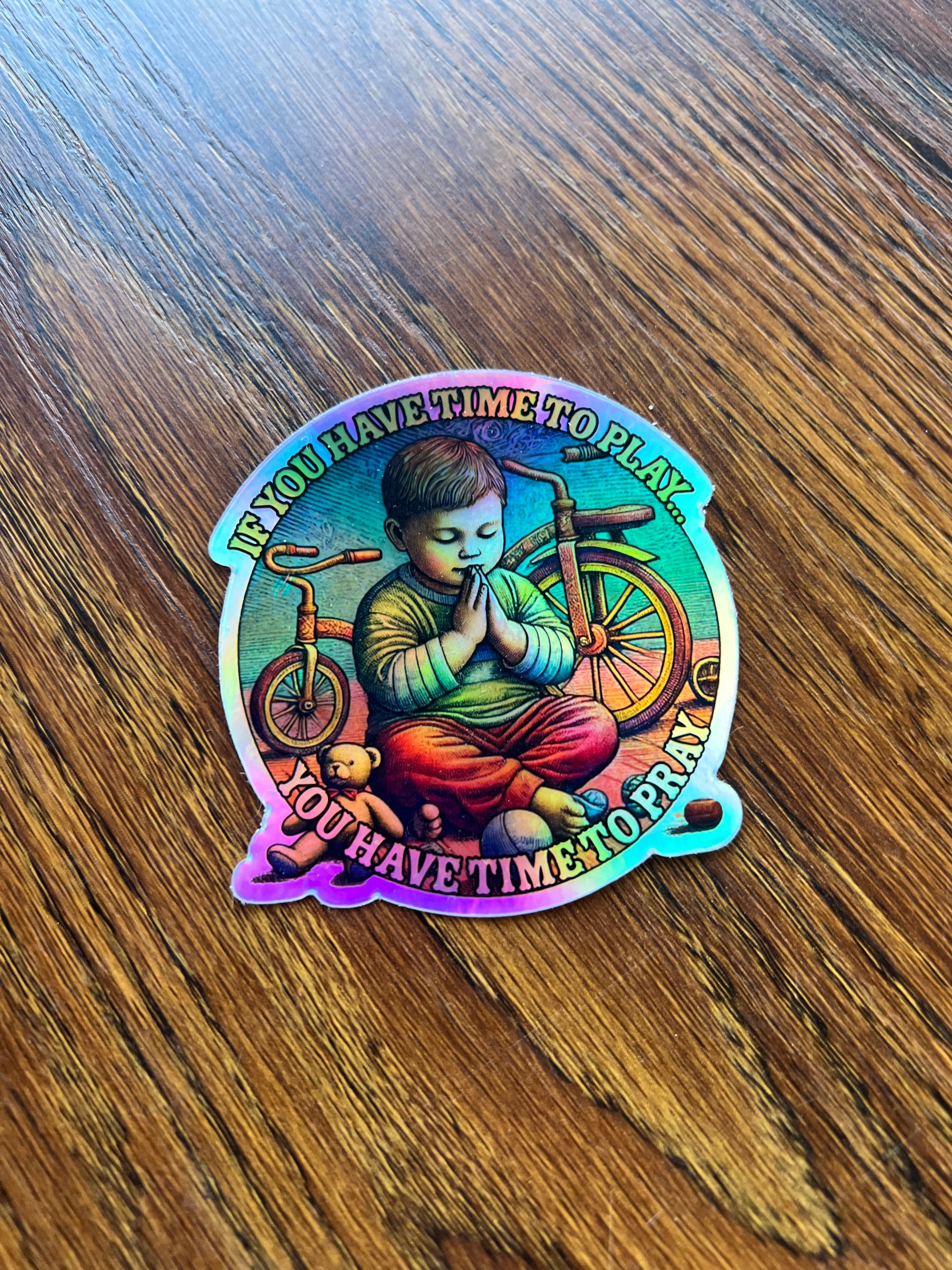 A thoughtful child sits cross-legged in a swirl of rainbow shimmer, palms pressed in prayer between playtime. With a teddy at his side and a bike behind him, this nostalgic sticker brings together innocence and intention. Equal parts adorable and affirming—a sticker with soul.