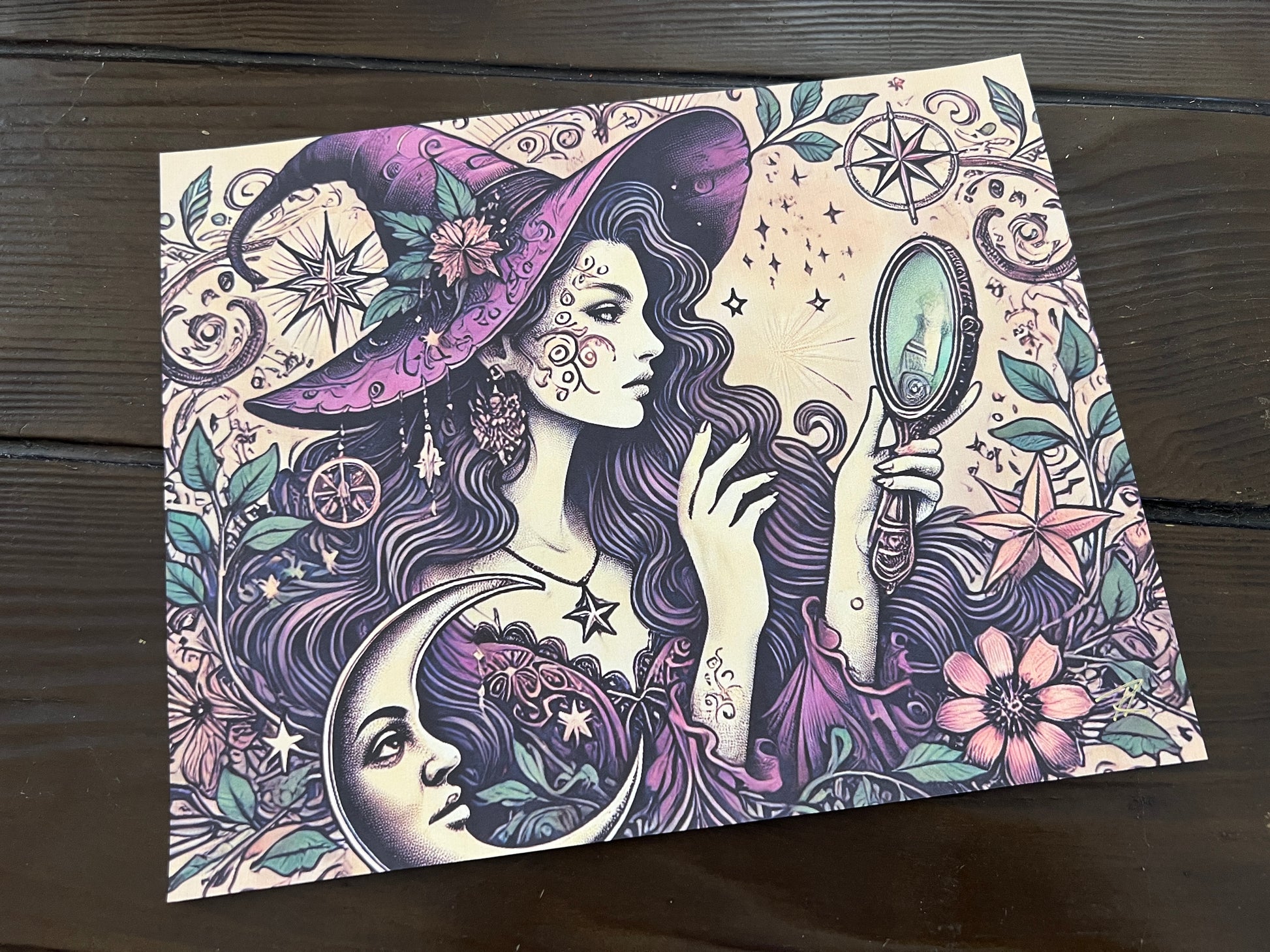 Clutching a scrying mirror and dressed in stardust and sigils, this mystic seer peers between worlds. Her violet curls echo lunar spirals, and celestial symbols bloom like secrets on her skin. This piece captures the sacred act of self-reflection, intuition, and magical clarity.